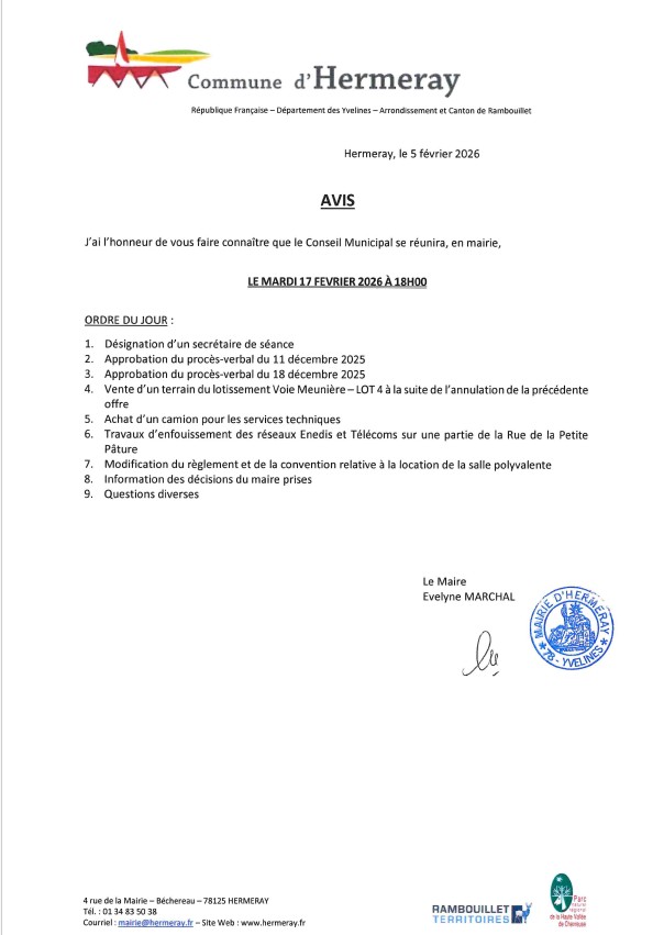 Le prochain Conseil Municipal aura lieu le Mardi 17 Février 2026 à 18h à la Salle du Conseil de la mairie.