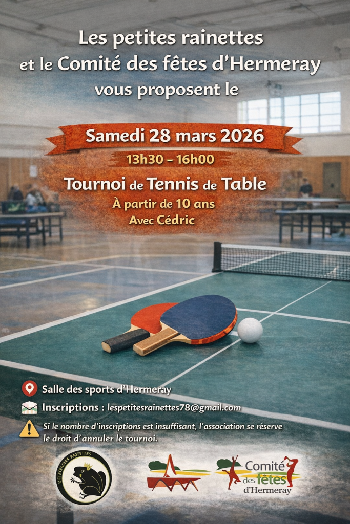 Les Petites Rainettes et le Comité des fêtes d’Hermeray vous proposent un Tournoi de Tennis de Table le Samedi 28 mars…