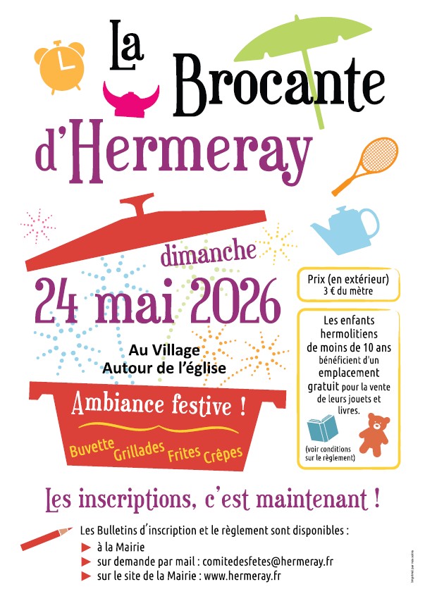 Notre brocante annuelle de Pentecôte est programmée le dimanche 24 mai. Inscrivez vous! Bien cordialement. Le comité des fêtes d’Hermeray